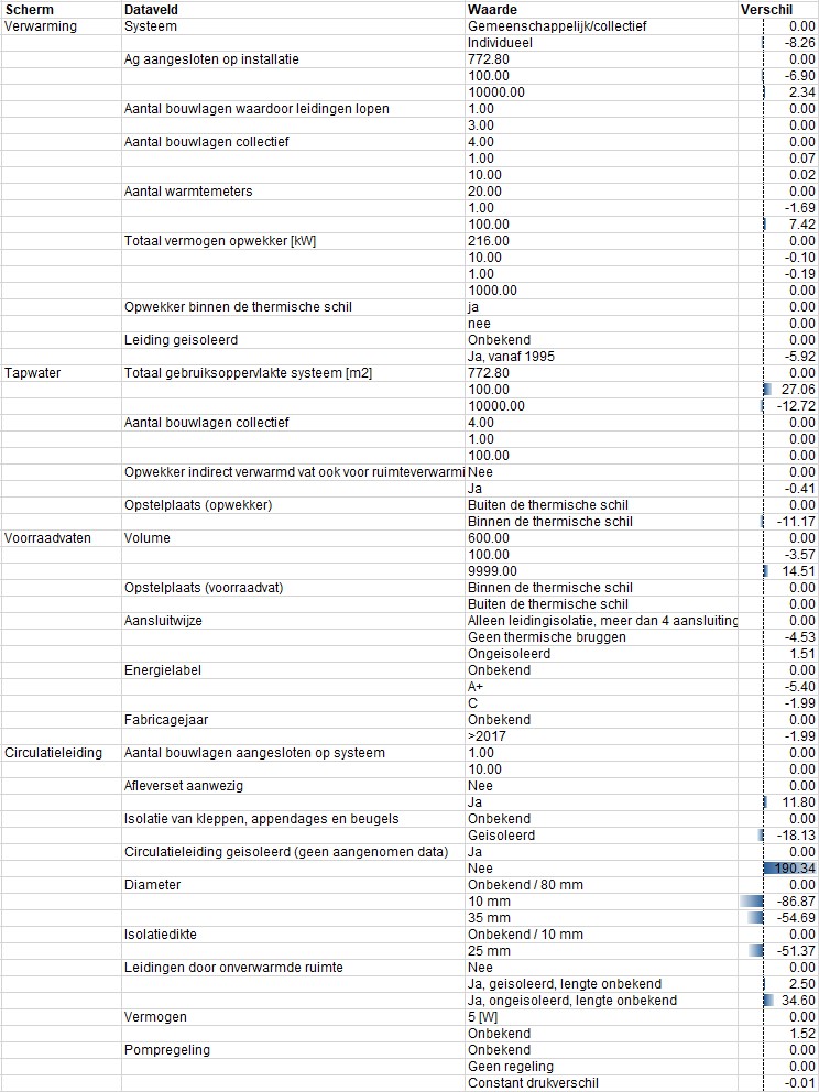 De volgende tabel toont het effect van aangenomen data voor een woning in een appartementencomplex met een gemeenschappelijke/collectieve installatie.